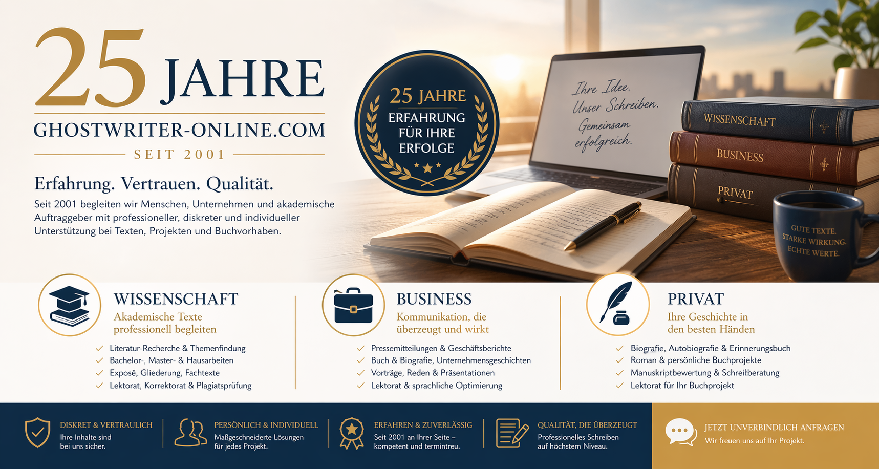 25 Jahre Ghostwriter-Online.com stehen für Erfahrung, Sprachgefühl, fachliche Breite und für die Fähigkeit, sehr unterschiedliche Projekte sicher und vertrauensvoll zu begleiten. Ob wissenschaftliche Arbeit, Business-Text, Biografie, Roman, Präsentation, Vortrag oder Lektorat: Wir suchen für unsere Kundinnen und Kunden nach der besten Lösung für ihre jeweilige Herausforderung. Bereits auf unserer Jubiläumsseite zum 20-jährigen Bestehen haben wir sichtbar gemacht, was Ghostwriter-Online.com bis heute besonders macht: die Verbindung von Wissenschaft, Business, persönlichen Geschichten, Büchern, Vorträgen und Präsentationen – also jene besondere thematische Vielfalt, die unsere Arbeit seit vielen Jahren trägt.