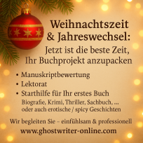 Weihnachtszeit & Jahreswechsel: Jetzt Ihr Buchprojekt starten oder vollenden. Manuskriptbewertung, Lektorat & professionelle Unterstützung bei Ghostwriter-Online.com.