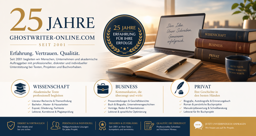 Seit 2001 – vertraulich, verlässlich, qualitativ: Unterstützung für wissenschaftliche Arbeiten, Business-Texte und Buchprojekte (Roman, Memoiren, Biographie, Sachbuch, Ratgeber).